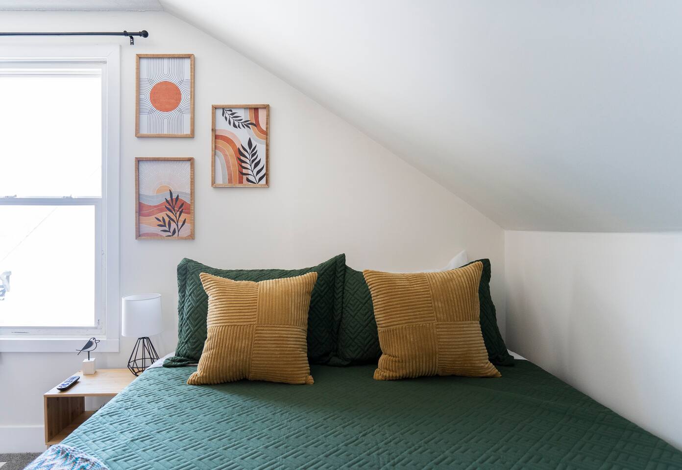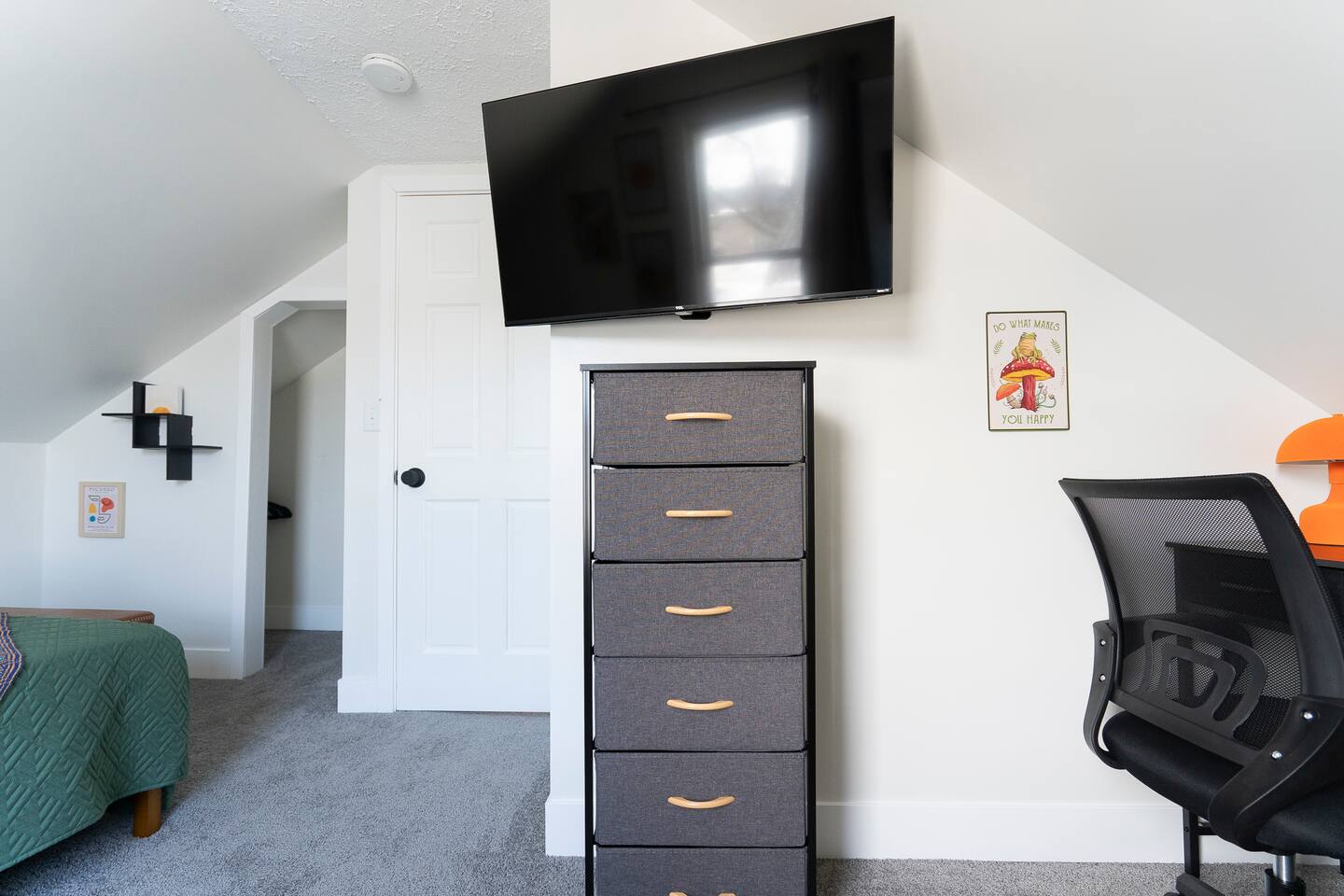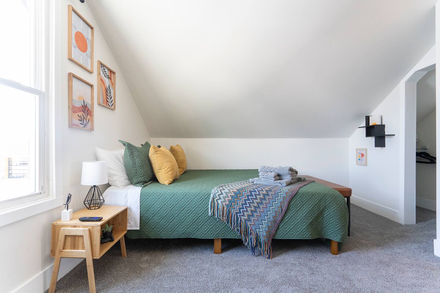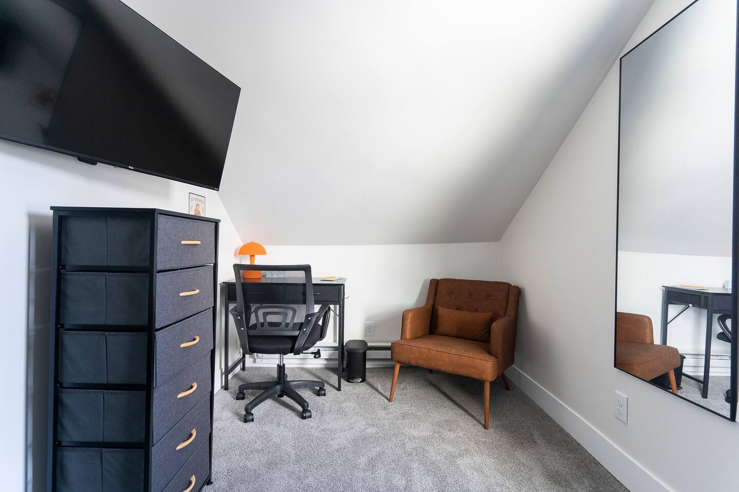This is private bedroom is on the 2nd floor in a shared home with 3 other guests. Room Features: - Luxurious queen bed with blackout curtains for a restful night's sleep - Smart TV for entertainment at your fingertips - Desk, closet, dresser, mini fridge, and fans for ultimate convenience - Space heater to keep you cozy - Comfortable couch to relax and unwind Shared Spaces: - Modern, shared bathroom designed with style and functionality - Property equipped with a security system for peace of mind Extras to Make You Feel at Home: - Two rolls of toilet paper - One roll of paper towels - Bath linens and an extra set of sheets