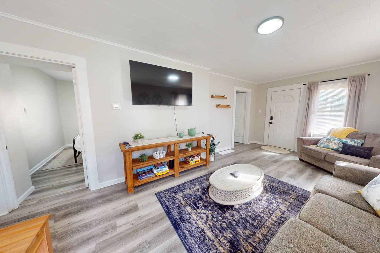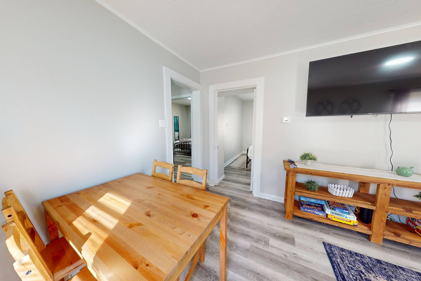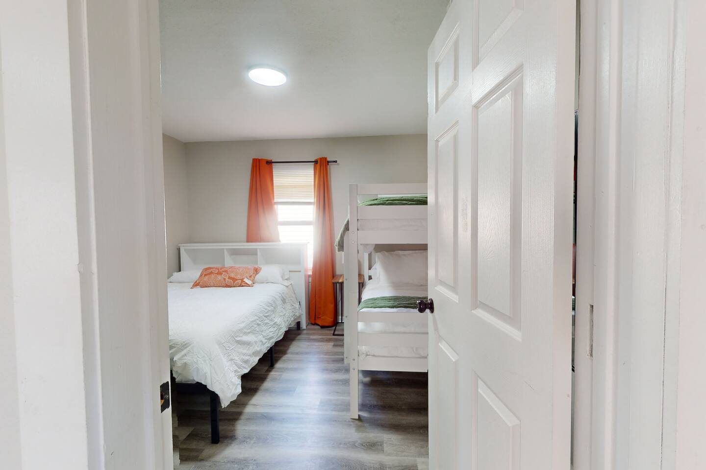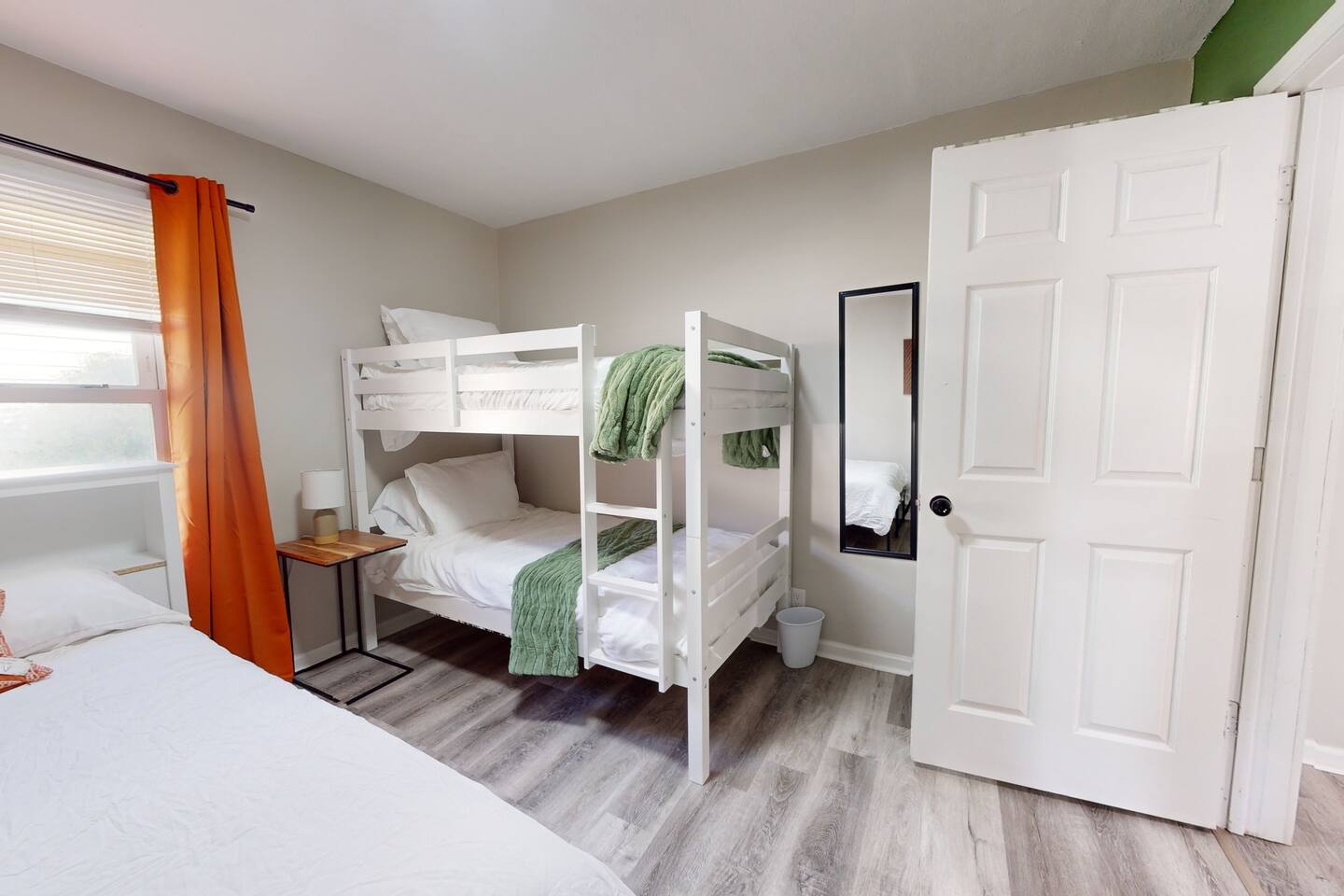 The Space: FEATURES/AMENITIES: - Accommodates 8 guests - Fenced front yard (pet-friendly) - Private parking - Free Wi-Fi - Smart TVs in multiple rooms - Board games - Washer/dryer - Coffee station with coffee provided - Fully stocked kitchen LIVING ROOM: - Comfortable seating - Smart TV - Board games for entertainment KITCHEN: - Full-size refrigerator - Stove/oven - Microwave - Coffee station with supplies - Cookware and dishware DINING AREA: - Dining table with seating for 6-8 BEDROOM #1: - Queen bed - Twin bunks - Cozy setup for kids or additional guests BEDROOM #2: - Queen bed - Closet BEDROOM #3: - King bed - Smart TV - Dresser BATHROOM #1 (inside Bedroom #3): - Tub/shower combo - Fresh towels and toiletries provided - Washer & Dryer BATHROOM #2: - Tub/shower combo - Fresh towels and toiletries provided OUTSIDE: - Fully fenced front yard - Partially fenced backyard - Space for outdoor activities Pet-friendly area