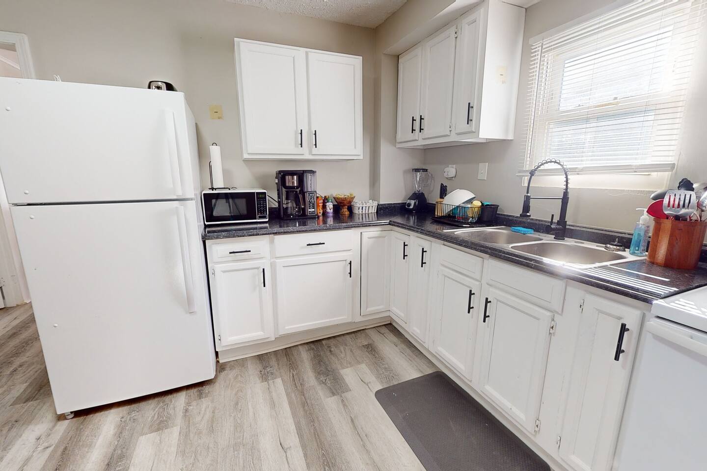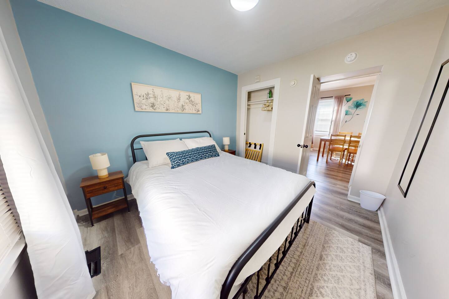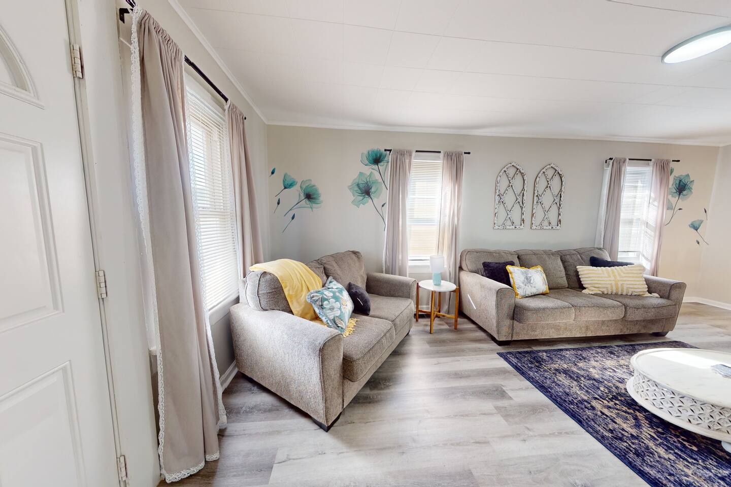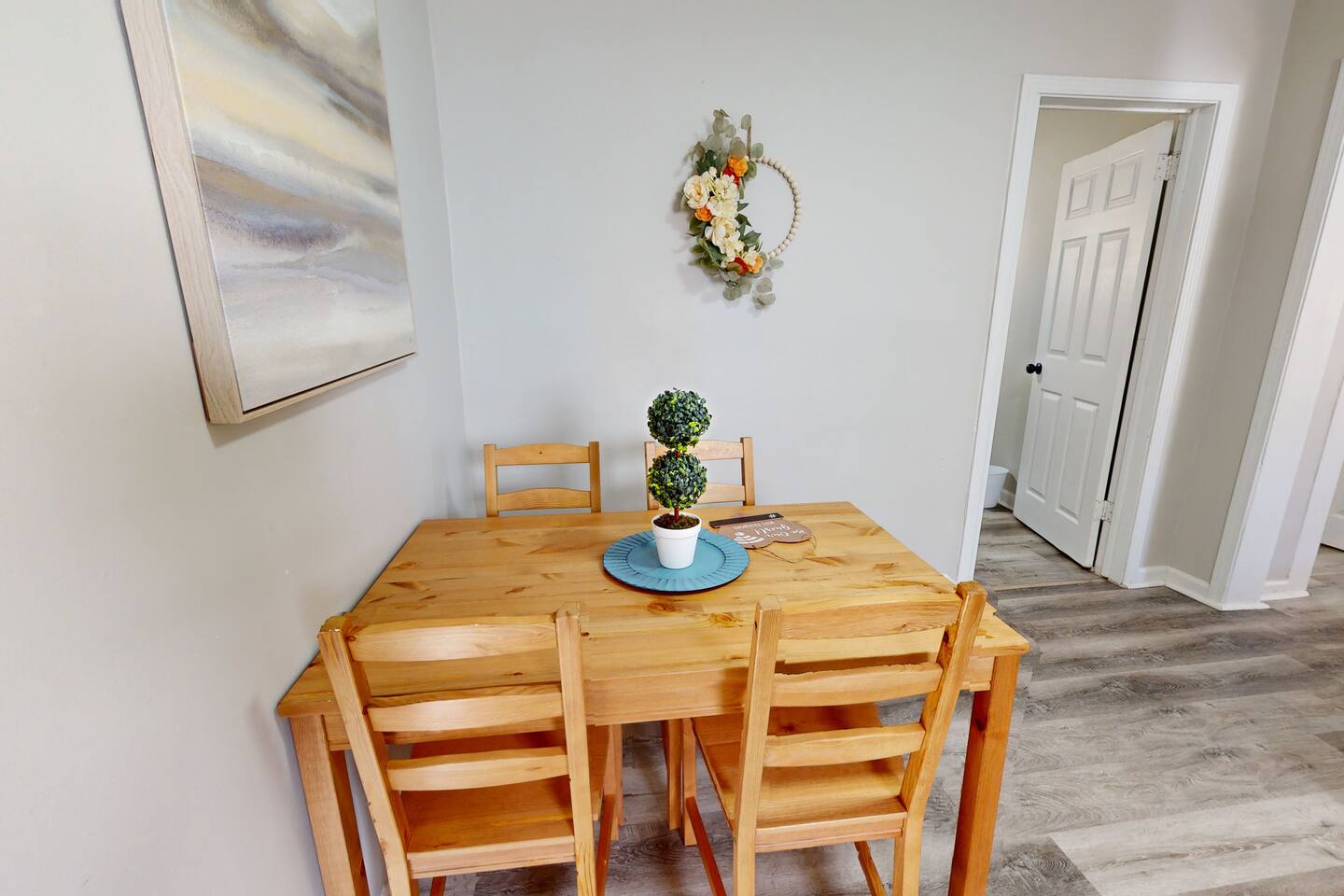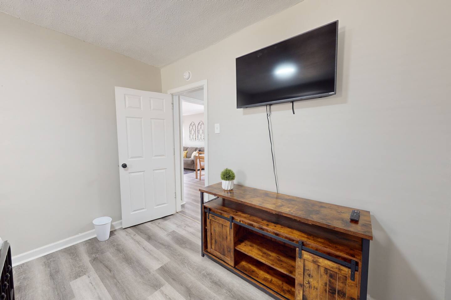 The Space: FEATURES/AMENITIES: - Accommodates 8 guests - Fenced front yard (pet-friendly) - Private parking - Free Wi-Fi - Smart TVs in multiple rooms - Board games - Washer/dryer - Coffee station with coffee provided - Fully stocked kitchen LIVING ROOM: - Comfortable seating - Smart TV - Board games for entertainment KITCHEN: - Full-size refrigerator - Stove/oven - Microwave - Coffee station with supplies - Cookware and dishware DINING AREA: - Dining table with seating for 6-8 BEDROOM #1: - Queen bed - Twin bunks - Cozy setup for kids or additional guests BEDROOM #2: - Queen bed - Closet BEDROOM #3: - King bed - Smart TV - Dresser BATHROOM #1 (inside Bedroom #3): - Tub/shower combo - Fresh towels and toiletries provided - Washer & Dryer BATHROOM #2: - Tub/shower combo - Fresh towels and toiletries provided OUTSIDE: - Fully fenced front yard - Partially fenced backyard - Space for outdoor activities Pet-friendly area