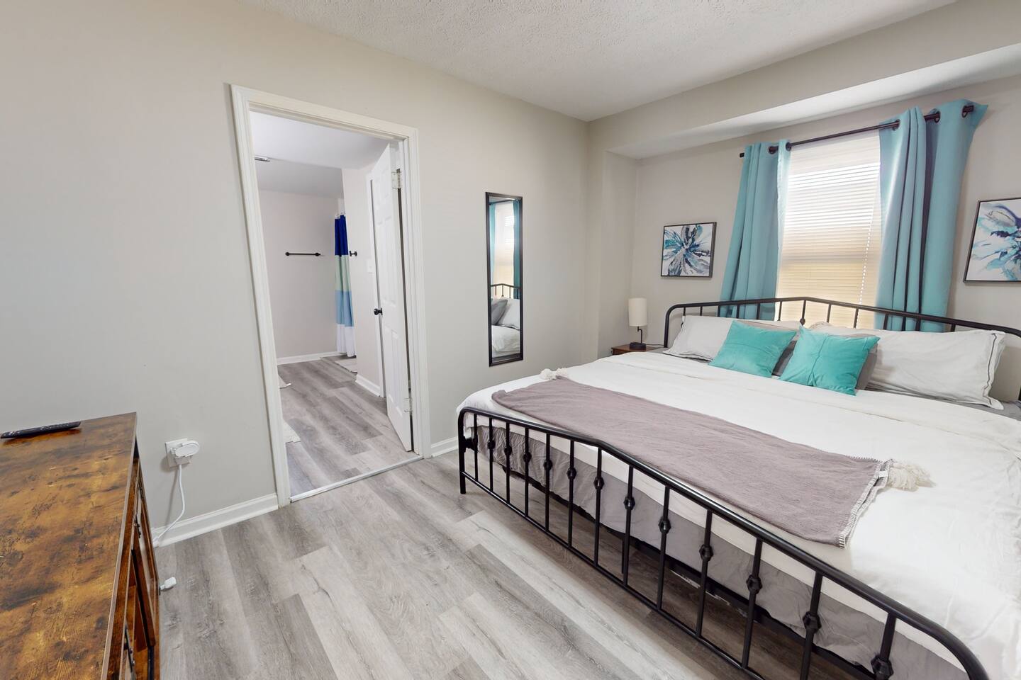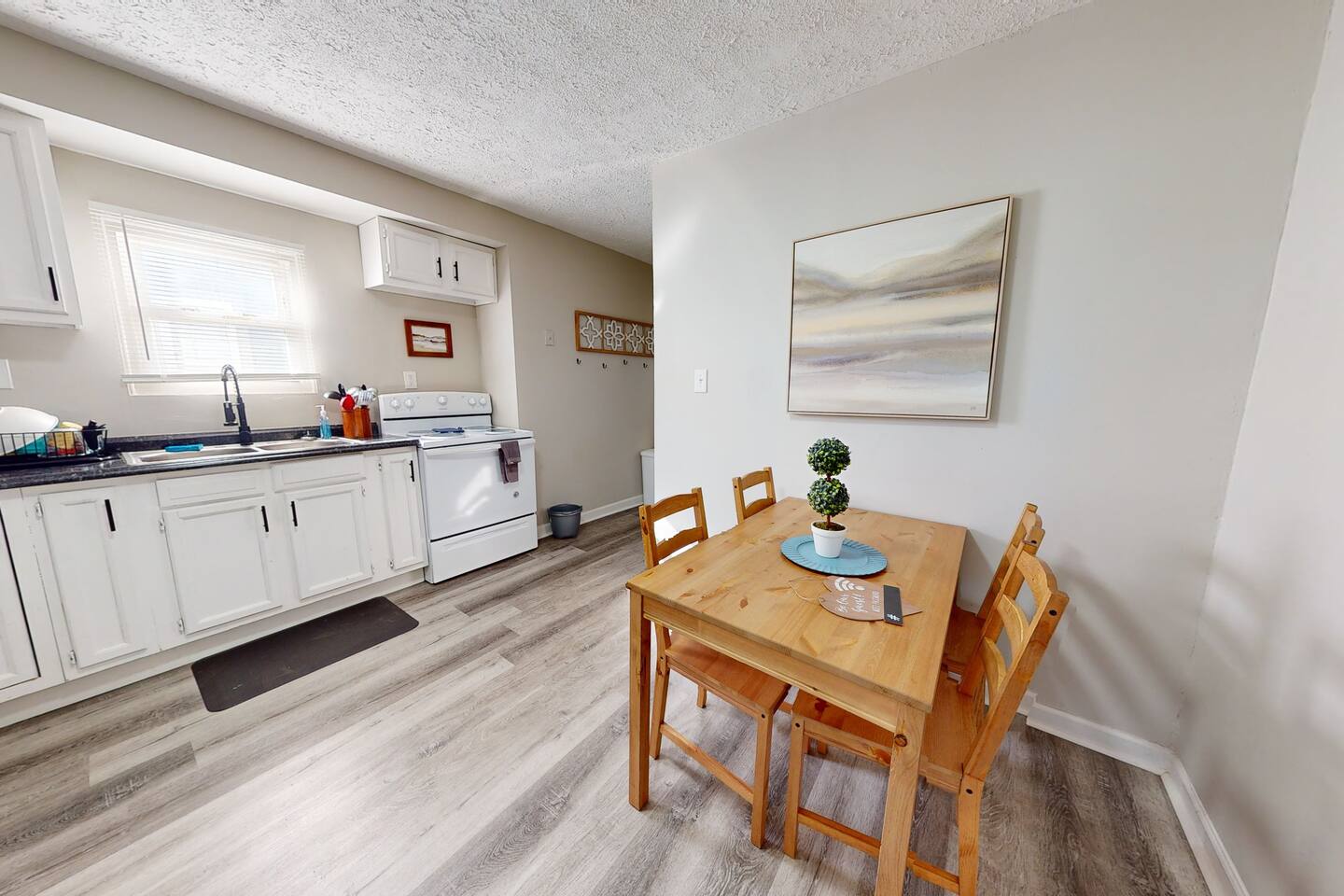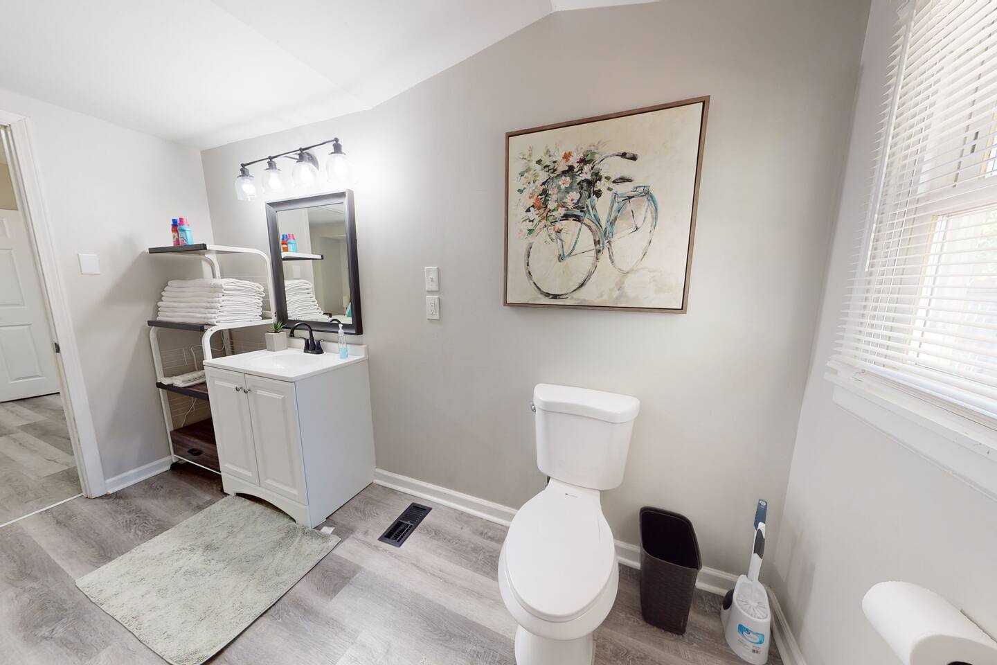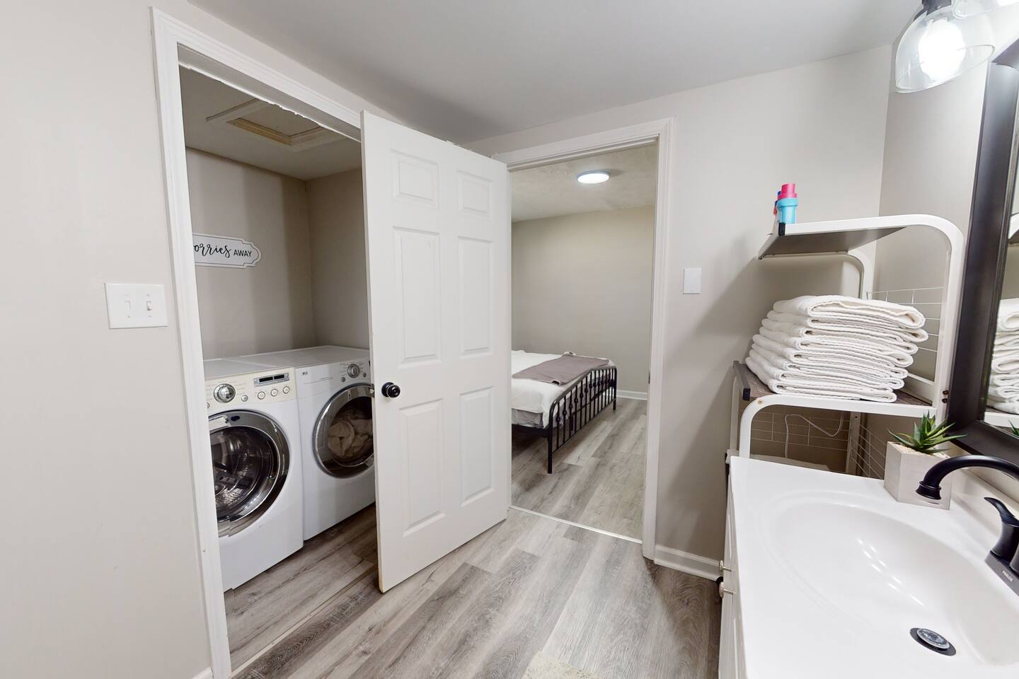 The Space: FEATURES/AMENITIES: - Accommodates 8 guests - Fenced front yard (pet-friendly) - Private parking - Free Wi-Fi - Smart TVs in multiple rooms - Board games - Washer/dryer - Coffee station with coffee provided - Fully stocked kitchen LIVING ROOM: - Comfortable seating - Smart TV - Board games for entertainment KITCHEN: - Full-size refrigerator - Stove/oven - Microwave - Coffee station with supplies - Cookware and dishware DINING AREA: - Dining table with seating for 6-8 BEDROOM #1: - Queen bed - Twin bunks - Cozy setup for kids or additional guests BEDROOM #2: - Queen bed - Closet BEDROOM #3: - King bed - Smart TV - Dresser BATHROOM #1 (inside Bedroom #3): - Tub/shower combo - Fresh towels and toiletries provided - Washer & Dryer BATHROOM #2: - Tub/shower combo - Fresh towels and toiletries provided OUTSIDE: - Fully fenced front yard - Partially fenced backyard - Space for outdoor activities Pet-friendly area