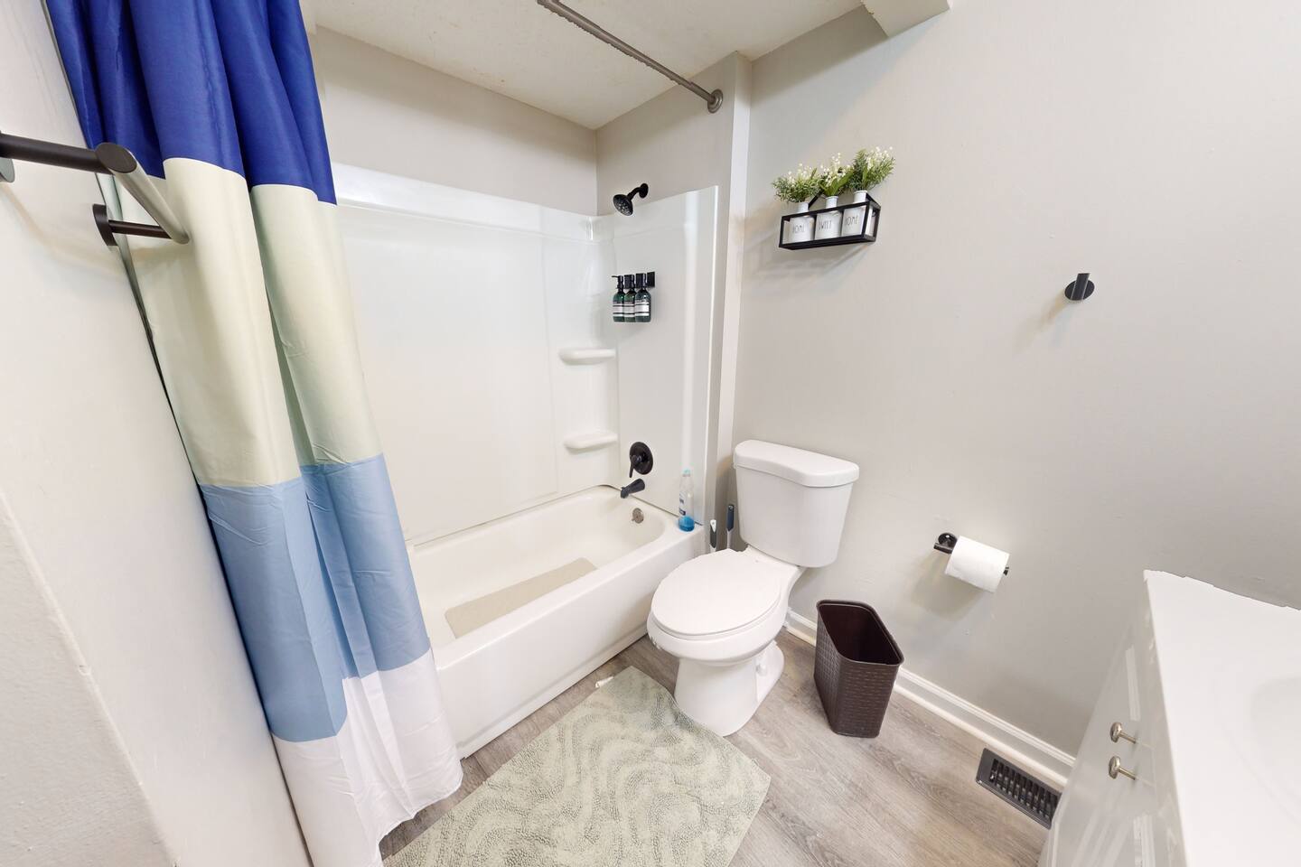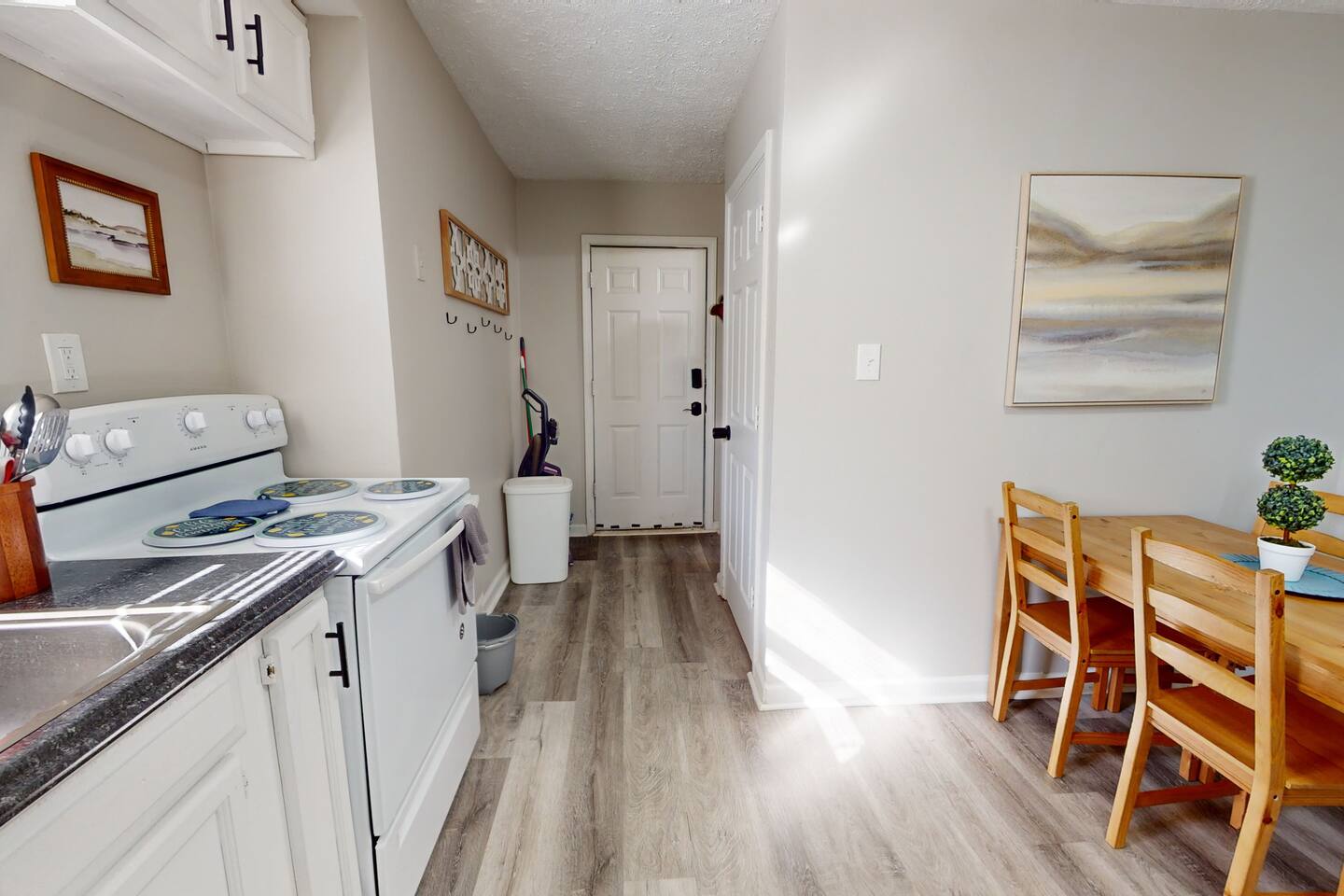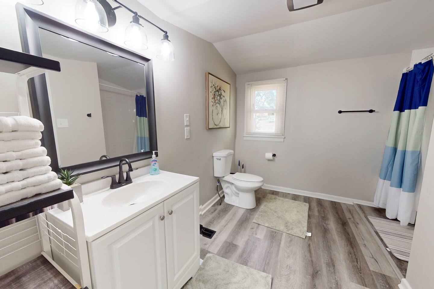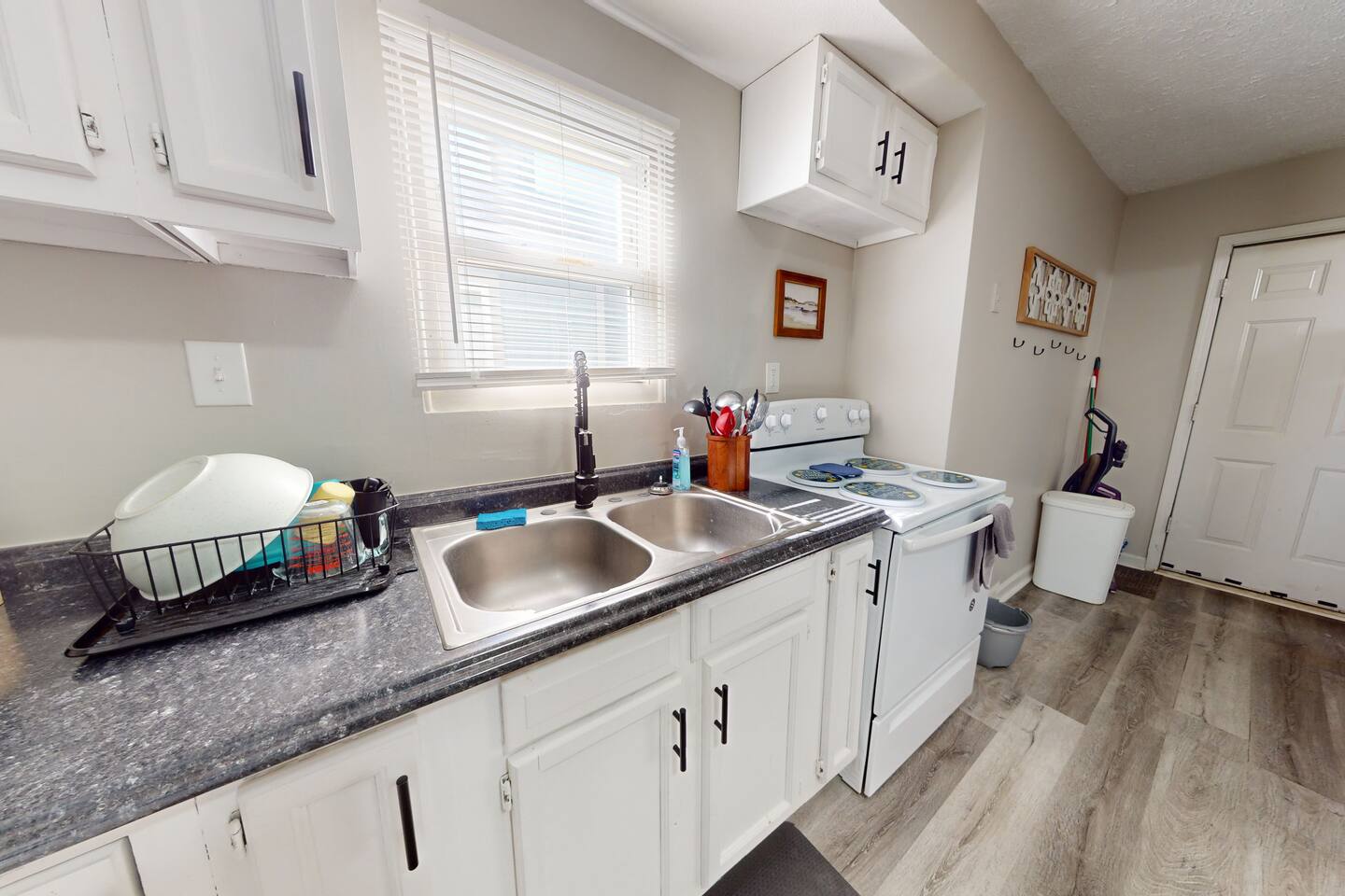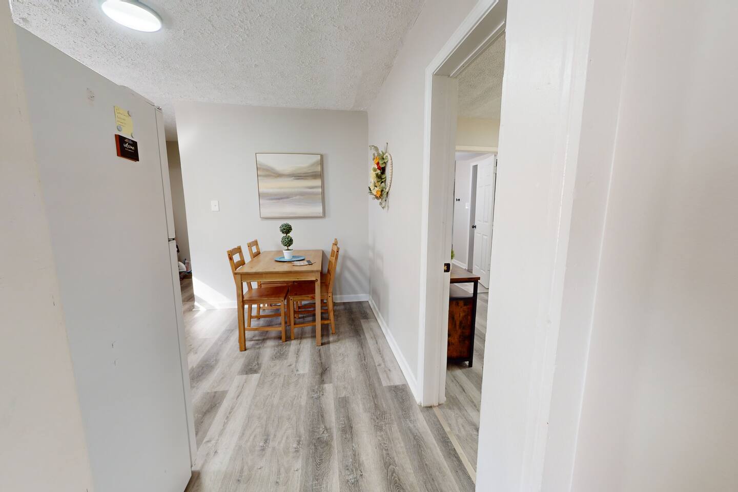 The Space: FEATURES/AMENITIES: - Accommodates 8 guests - Fenced front yard (pet-friendly) - Private parking - Free Wi-Fi - Smart TVs in multiple rooms - Board games - Washer/dryer - Coffee station with coffee provided - Fully stocked kitchen LIVING ROOM: - Comfortable seating - Smart TV - Board games for entertainment KITCHEN: - Full-size refrigerator - Stove/oven - Microwave - Coffee station with supplies - Cookware and dishware DINING AREA: - Dining table with seating for 6-8 BEDROOM #1: - Queen bed - Twin bunks - Cozy setup for kids or additional guests BEDROOM #2: - Queen bed - Closet BEDROOM #3: - King bed - Smart TV - Dresser BATHROOM #1 (inside Bedroom #3): - Tub/shower combo - Fresh towels and toiletries provided - Washer & Dryer BATHROOM #2: - Tub/shower combo - Fresh towels and toiletries provided OUTSIDE: - Fully fenced front yard - Partially fenced backyard - Space for outdoor activities Pet-friendly area